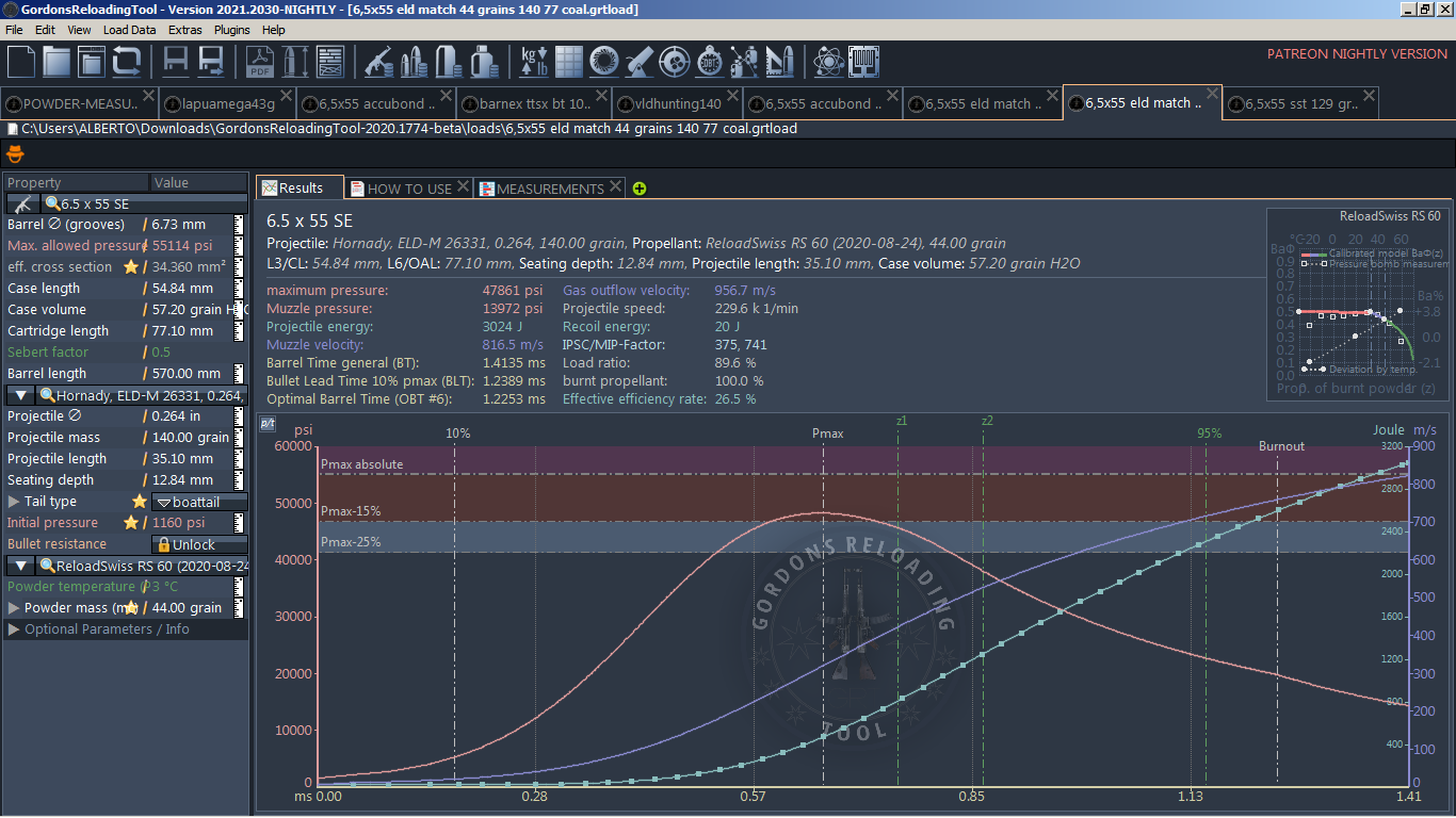 Comprobando todos los datos, me doy cuenta que hay un valor que marca por defecto "initial Pressure", si lo modifico eligiendo las posibilidades que me da al abrir su ventana y pongo tipo de proyectil normal, me da mucha menos presion en el parametro que digo y se hacerca mucho a la velocidad real y me baja bastante la presion de PSI total de la carga.