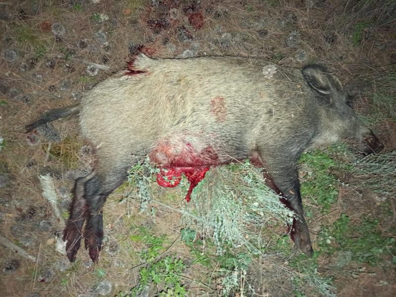 Con guarros con el 308W de 130 grns y el tiro colocado todos los guarros han caído secos. Tiros de espera nocturna a 75 metros. Precisamente el de la foto, bastante grande, pero no el mayor que tirado con la barnes TTSX de 130 grns, le tire de arriba a abajo, entrándole el disparo por la grupa y saliendo por el vientre. Reventado quedo!.