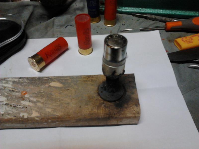 descastao escribió:En otro rato de esos en que lo dejan a uno tranquilo, me he echo un molde para bala, al estilo del compañero onekrlosfn. He cojido una llave de baso de 14mm y un trozo de barilla roscada y este es el resultado... Dos cartuchos rolls de 31grs y dos de rio 20, los he abierto uno por uno, fundido y vuelto a poner "la bala", sin modificar ni polvora ni taco. he puesto dos con la "punta" hacia delante y dos al contrario, para ver como vuelan. He provado la bala junto con el taco en el choke de 4* de la mossber y pasan simplemente rozando. Haber como van!.