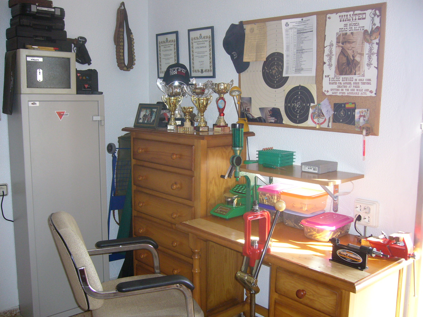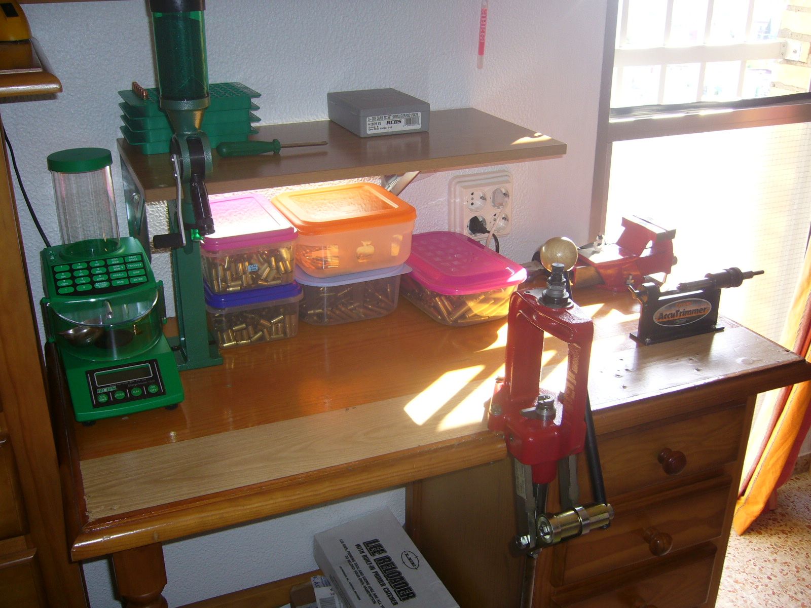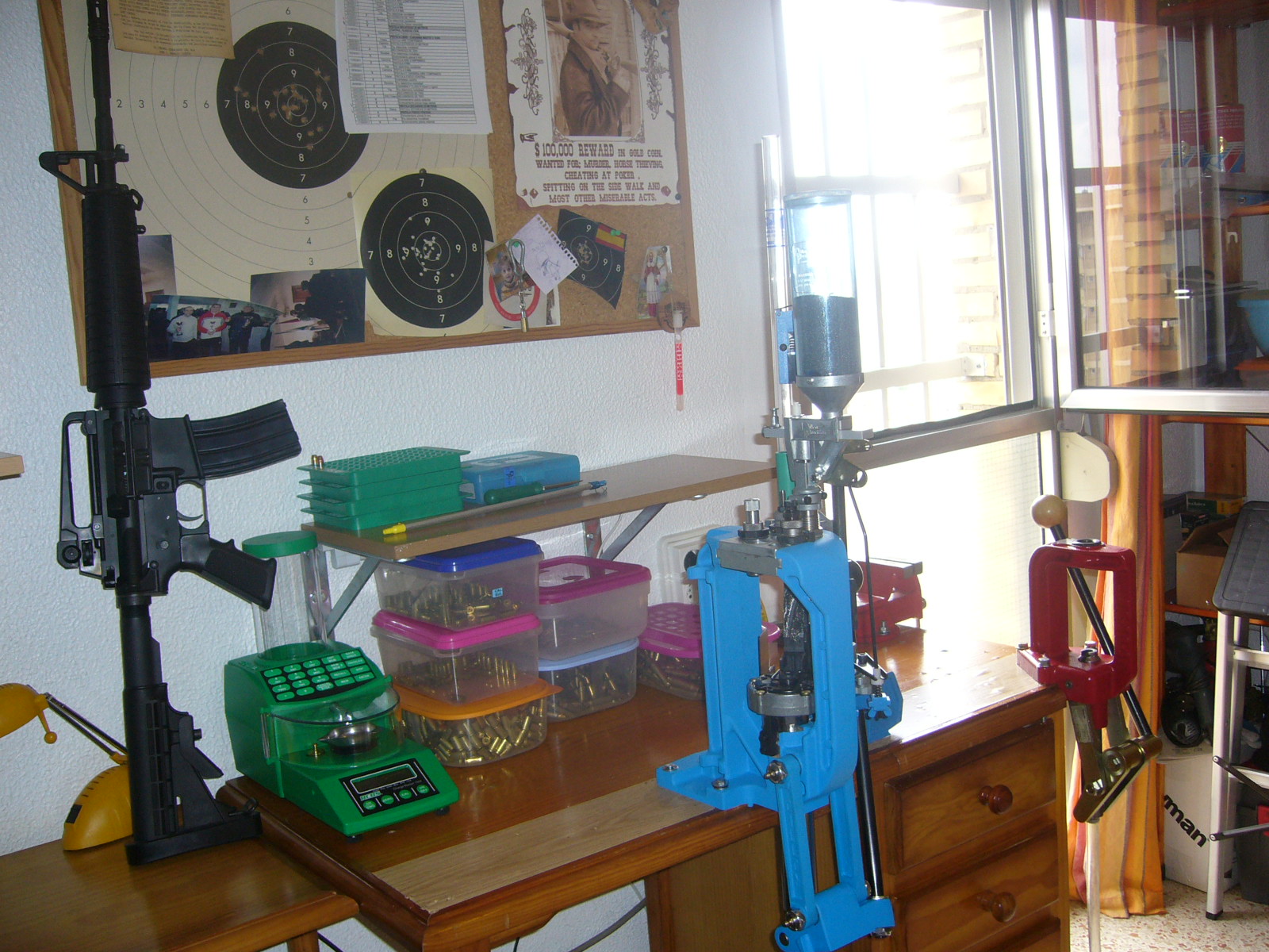 Mi pequeño Rincocillo,, a la derecha tengo unas estanterías con todos los componentes y demás, de momento como no hago recorrido ni nada de eso con mi monoestación recargo más que suficiente del 9 pb para precisión,, y para rifle pues más que de sobra en calibres 222R-308w-307w.