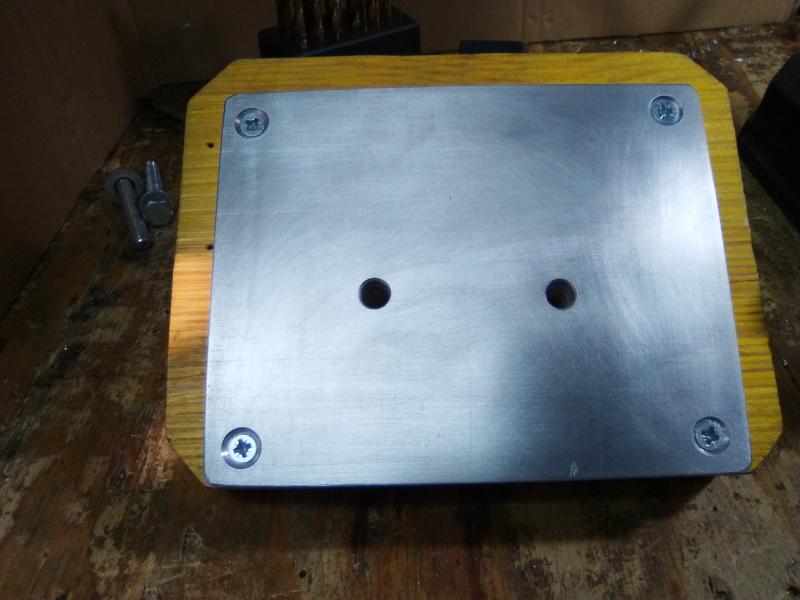 Te pongo unas fotos de la que he hecho esta tarde, al ser una placa delgada de 10 mm (es lo que he encontrado) no he puesto la resistencia (6mm) en ella misma sino por debajo, embutida en la madera (como tenia esta lyman 450 originariamente con la resistencia de la pistola de encolar) al tener el agujero mas grande de lo necesario ya hecho en la madera, y ser esta resistencia mas pequeña aun metiéndola en un trozo de perfil de aluminio para que se propague mejor el calor, lo que sobraba de hueco lo he rellenado con papel aluminio tal cual lo tenia antes y así llevaba funcionando unos 7 años con la resistencia de cola caliente y sin placa de aluminio sino la maquina directamente encima del agujero de la madera.