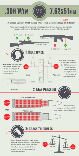 La primera conclusión que puede verse en el gráfico es que intercambiar estos cartuchos y disparar con ellos en rifles de ambos calibres puede resultar peligroso. Así, según aparece en el gráfico, disparar munición del .308 Win en un arma militar del 7.62×51, la cual tiene una recámara ligeramente más larga, es potencialmente peligroso. Sin embargo, disparar con cartuchos militares del 7.62 en un rifle “civilizado” del .308 es seguro. Esto se debe al diferente headspace (distancia entre la cara del cerrojo y el tope de la recámara donde apoya la vaina) que presentan ambos cartuchos.