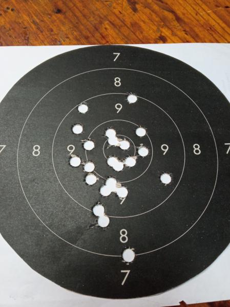 Rossi 92 45 Colt, 50 m, apoyado con los codos en mesa sin sacos ni ningún elemento de puntería, miras de hierro y apuntando a centro de negro.
