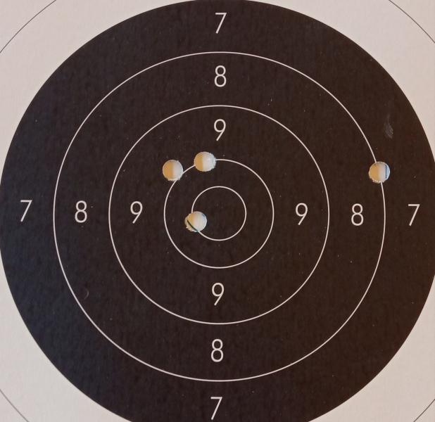 Estabiliza muy bien los proyectiles.colime el visor, primer disparo a las tres, un 8, tres click a la izquierda y un grupo en algo menos de un MOA. La diana es a 100 m.