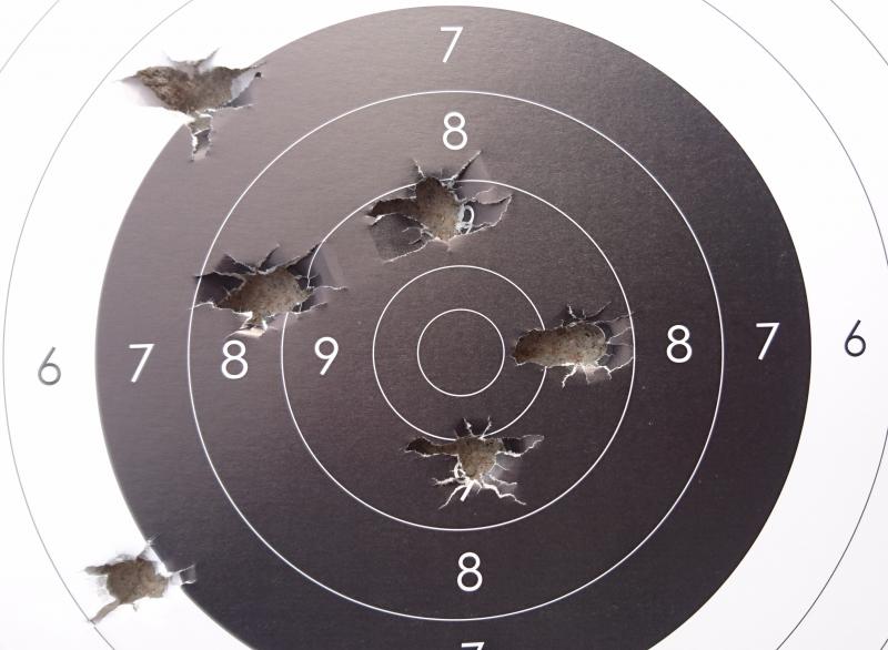 La agrupacion està bastante bien, pero ese rasgado de la cartulina delata la baja velocidad a la que el proyectil hace impacto