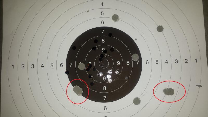 Yo estaba más pendiente de ella que del blanco, así que miro la caja y efectivamente había dos agujeros. El provocado por la bala muy cerca de la cruz y el provocado por el taco a unos centímetros y que se había desprendido en el disparo.