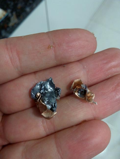 Tal y como veréis en las foto de los restos, se ve que la deformación es aleatoria. Dado que no es una punta de caza, no esta diseñada para tener una deformación prevista, de tipo hongo, de fragmentación, etc,... Es por ello que la forma de los restos resultantes es completamente irregular.