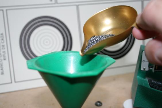 Se trasvasa la pólvora que hemos pesado a la vaina con un embudo especial que tiene una copa interior donde la boca de la vaina hace tope.