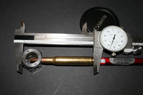 Para medir uso el utensilio que se ve en la foto. Tiene un cuerpo tubular central, un empujador, un retén del empujador, una ventana con corte cuadrado ya veremos para qué y rosca en un extremo. Con él se usa unas vainas especiales que se enroscan en ese extremos y hacen una unidad con el empujador; además tienen el cuello ligeramente más grande del calibre para que la bala se mueva libremente.