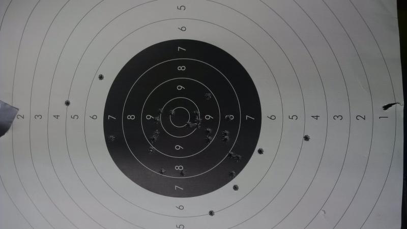Os subo foto de un blanco a 100m probando cargas sin visor solo con punto rojo que a esa distancia cubre todo el negro. Menos 6 todos dentro que no esta mal.