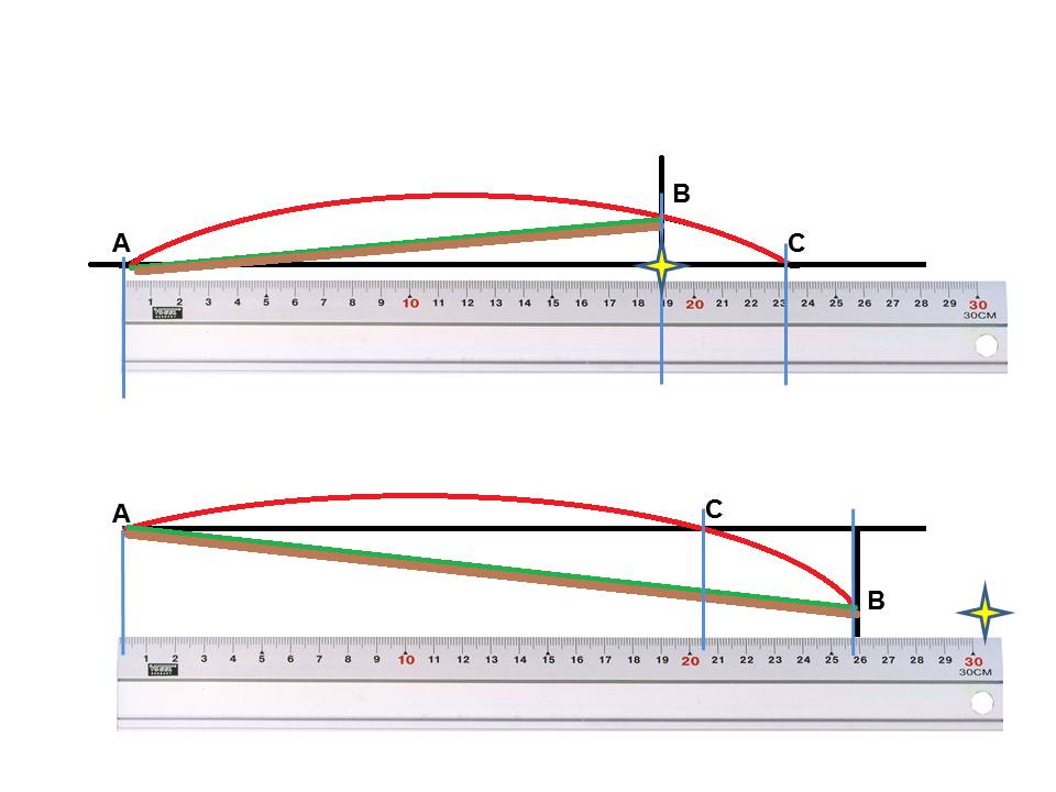 En este caso si ajustáramos nuestro visor para disparar a la distancia sobre la horizontal a la que se encuentra el punto B (19cm), nuestro proyectil seguiría una trayectoria que terminaría en la ESTRELLA AMARILLA, en consecuencia el disparo impactaría más bajo de lo pretendido, teniendo como consecuencia fallar el tiro.En realidad el disparo no ha ido bajo, si no CORTO.