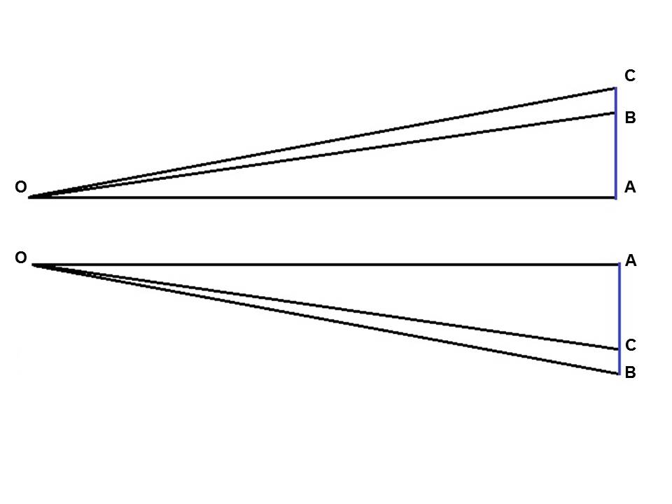Si trazamos la línea AC (línea imaginaria entre el fusil y el objetivo) y la hacemos girar sobre el eje descrito por la posición del tirador a consecuencia de apuntar a un objetivo más alto o más bajo, se puede observar que se comienza a describir una circunferencia que se aleja de la distancia AC a medida que aumentamos el ángulo al que apuntamos (ángulo de situación)