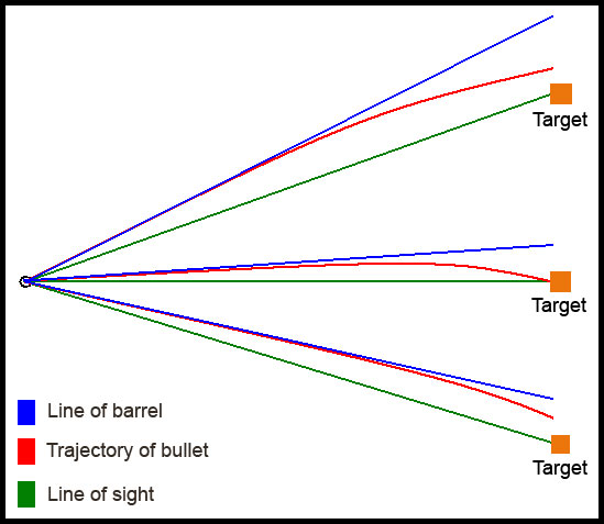 De este modo un objetivo que se encuentre a una distancia hipotética de 100m precisara de un ajuste en elevación adicional si se encuentra bien por encima o por debajo de la horizontal.