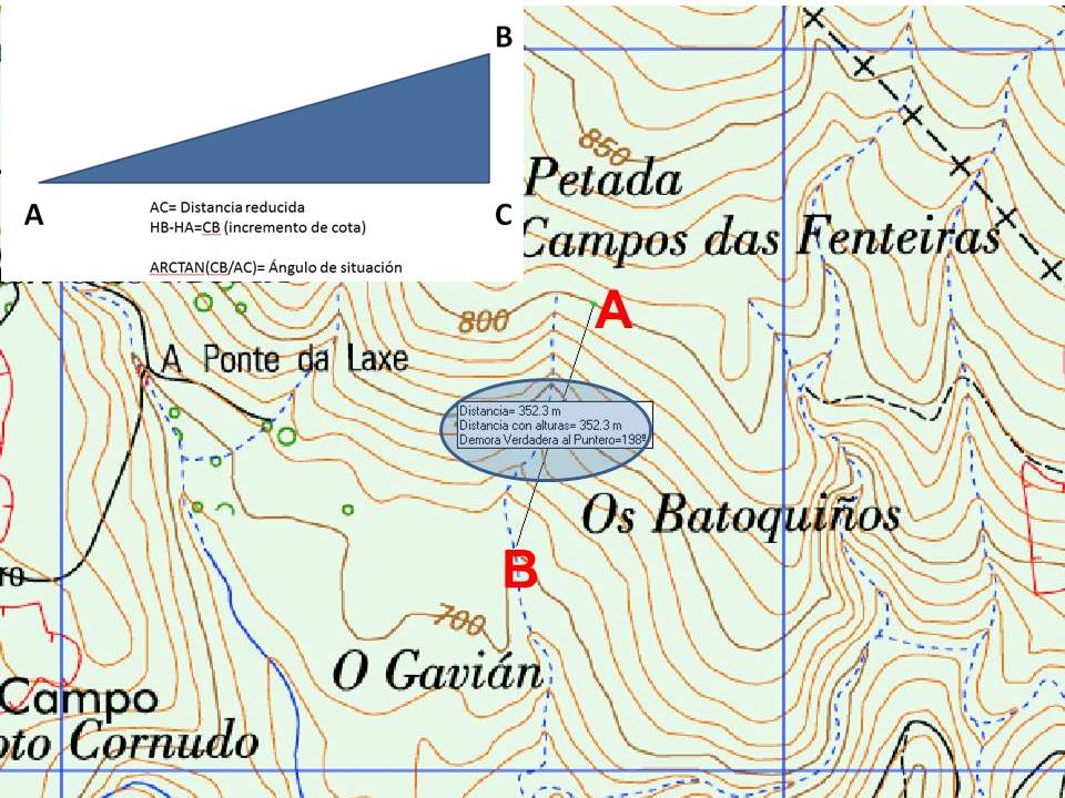 Sobre un mapa topográfico calculamos la distancia reducida (Distancia del punto A al B sin tener en cuenta las alturas)