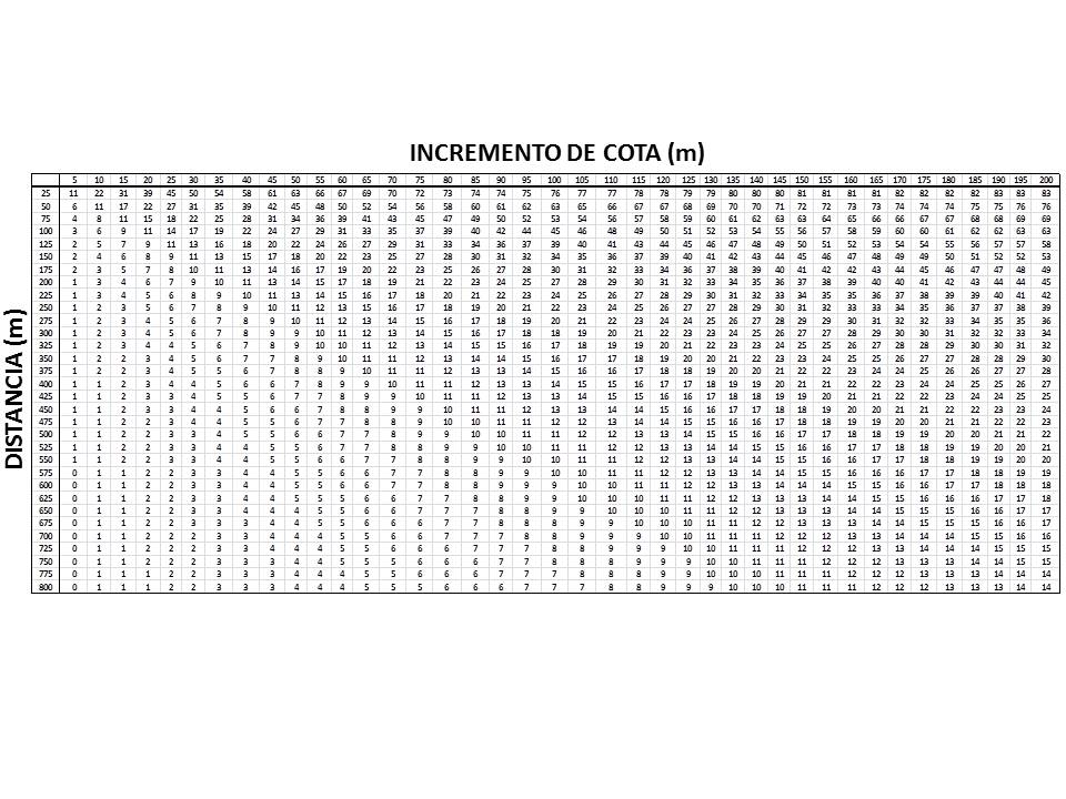 Con los datos calculados entramos en la tabla y obtenemos que para un incremento de cota de 13m y una distancia de 350 obtenemos un ángulo de 16ª