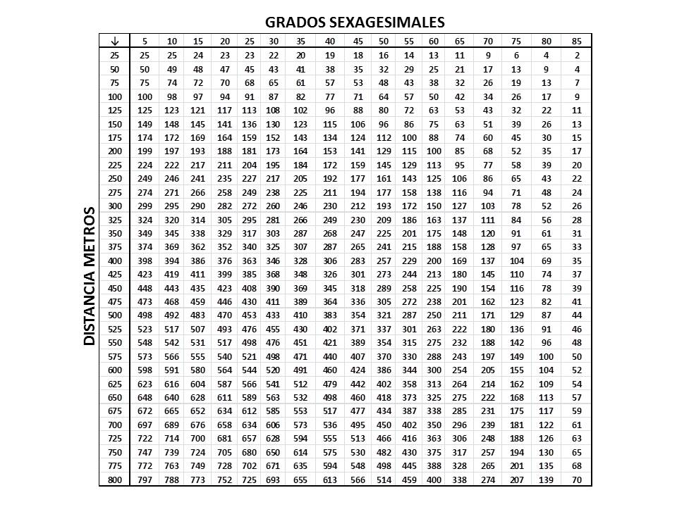 Las tablas de tiro vienen referenciadas para distancias sobre el eje X sin tener en consideración ángulo del disparo. Véase que el punto descrito tiene una proyección sobre la horizontal de 70.71m.