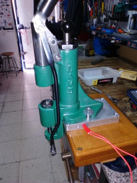 Es similar a la que vende (y bien vendida) Lyman. La única dificultad que tiene este invento es encontrar este tipo de perfil de aluminio, por que la fabricación es bien sencilla, solo se trata de hacer los taladros pertinentes para instalar la recalibradora, entre la mesa y la placa hay que poner un cartón/fibra de vidrio que haga de aislante.