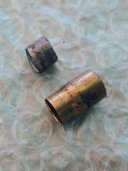 Para recargar 32sw normalmente he usado puntas HN. .312" y 100gn con 1.2 o 1.3 de carga. He cambiado las puntas por otras iguales pero de .313" y en 100 disparos tuve dos fallos como el que se ve en las fotos. Parece que esos plomos "se agarran" a la vaina, dejando un anillo de plomo en el cañón, y sólo el núcleo sale disparado.