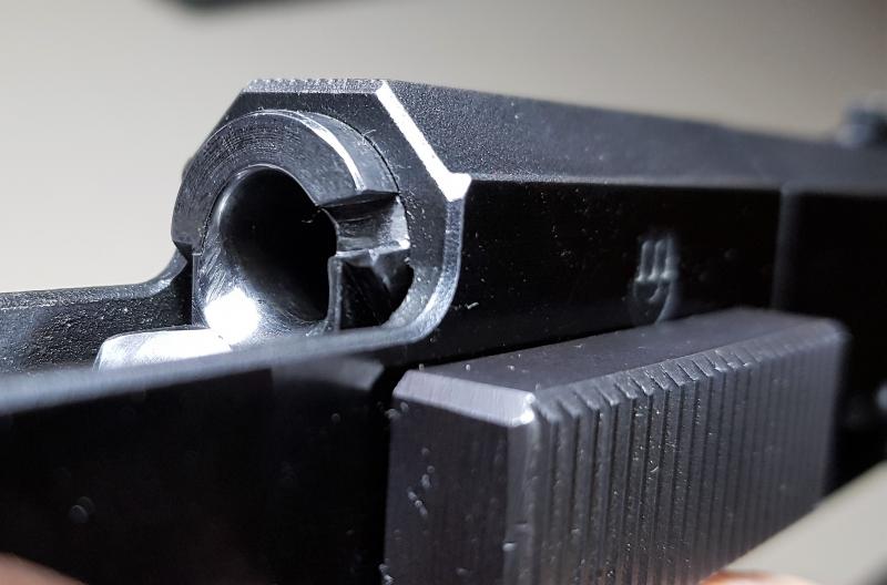 Lo del crimp lo tengo claro, se soluciona no crimpado más, sino puliendo las rampas de alimentación, la parte del armazón (del bloque del gatillo en realidad) y la parte del cañón, ya lo he hecho con lijas crecientes desde grano 180, pasando por 280, 360, 500, 600 y 1000, finalmente el acabado ha sido con lanilla de acero, con lo que me ha quedado un espejo perfecto.