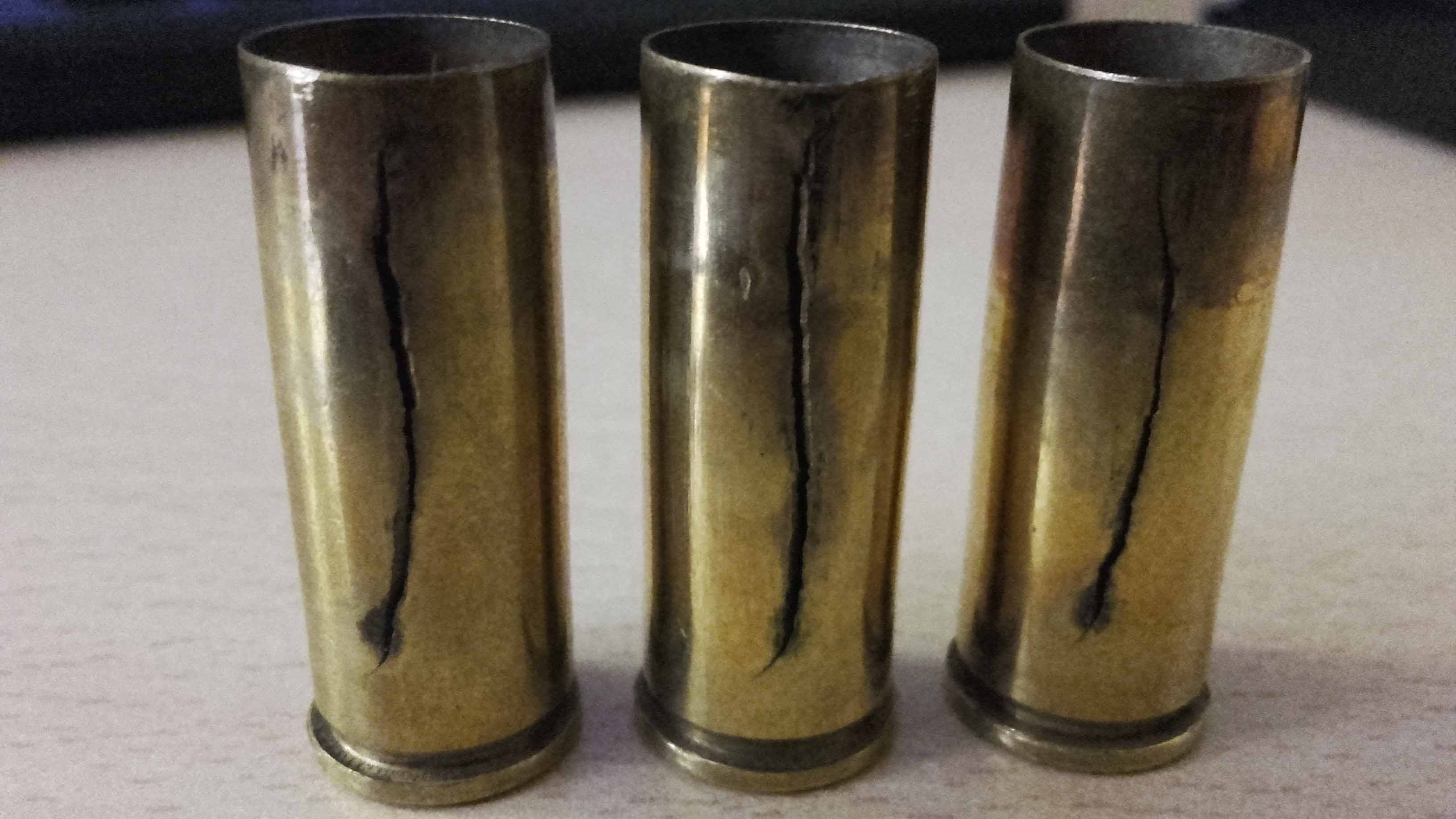 Recargo para un rifle de palanca Rossi del .45 Colt de 20 pulgadas guiado en D, no consigo dar con la explicación del porque de estas roturas en las vainas, de 25 cartuchos a tres les paso esto, tuve que esperar unos minutos para poder sacar la vaina, no por la dilatación sino por la rotura que rozaba en la recamara, el resto de las vainas salían por gravedad y sin signo alguno de sobrepresión, en estas tres tampoco había signo alguno de sobrepresión: