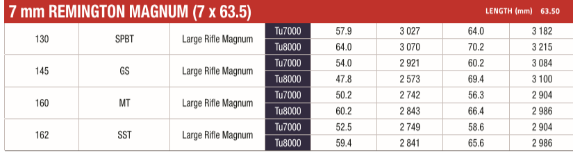 No hay cargas de TU3000 para el 7mm. R.M., ni para ningún cartucho similar, ni de lejos.