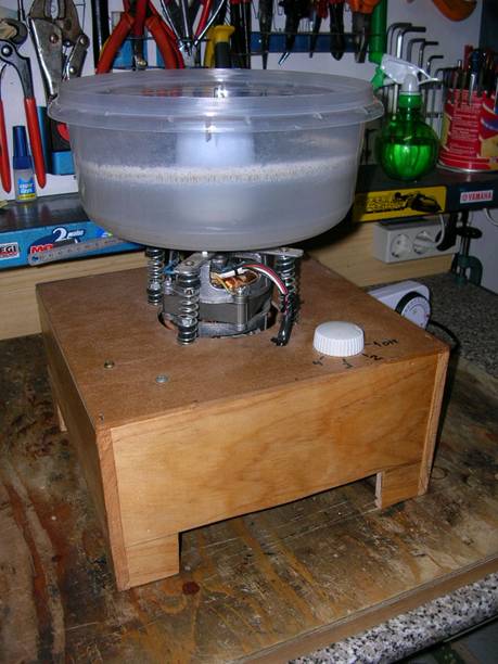 El primero que fabrique hace un montón de años, miles y miles de vainas limpiadas con él y sigue funcionando ya a empujones. Entran unas 250 vainas del 9mm. Motor de ventilador de 60 w con tres marchas, un tapper, unos muelles, una caja de vinos vacia y tornillos. Arroz y limpiavitroceramica, las deja como nuevas. Después de este he fabricado cuatro o cinco mas.