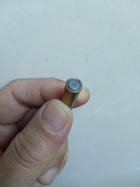 En la primera foto se ve un pezón que sobresale ligeramente del ras de la boca de la vaina y que no obstaculiza en absoluto el ciclado porque resalta muy poquito y tiene menor diámetro que el calibre. Algunas balas WC componentes lo tienen; la Lapua de munición original también, tanto en .32 como en .38. Otras son planas, o tienen un canal de flexión como las Lazar, un ligero valle con pequeña protuberancia como las RG, etc. Lo importante es que son cilíndricas.