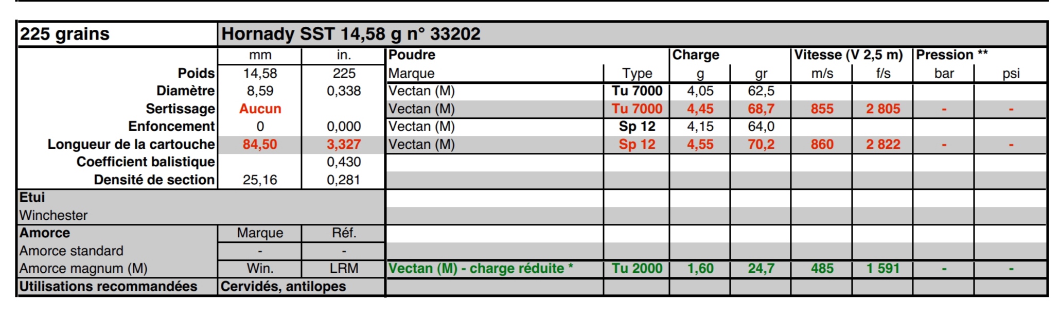 Voy a recargar unas cuantas balas del 338 Wm. la pólvora que voy a usar es la Vectan Tubal 7.000 y los proyectiles, Hornady SSt 225 Grains.