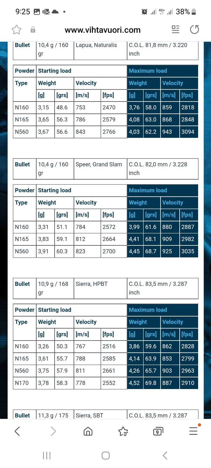 Bajate la App. de Vithavuori hay un monton de cargas por cada calibre y diferentes polvoras y puntas.