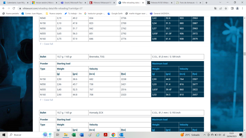 Adjunto la tabla de la pólvora para la VIHTAVUORI N150 y el peso de 165 gr del 3006 haber que os parece.