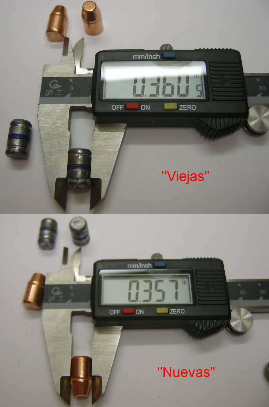 Amigo "Tomate", tras leer lo que me has puesto, me puse a medir, pesar etc. estas dos puntas (llamémoslas "viejas y nuevas"). Con las Wad Cutter no he conseguido medir dos iguales, no es que las haya medido todas claro está pero, si que muchas, todas oscilaban entre .357 y .360 y con el peso pasaba lo mismo. Sin embargo con las nuevas que me llegaron de 158gr, cobreadas y "tronco-cónicas" (más abajo pondré fotos) estas si que pesan casi todas y miden lo mismo. Ya había hecho yo unas 100 para la competición y pruebas con los 2,5gn, haré las pruebas que me has dicho e iré subiendo poco a poco hasta llegar a "ese equilibrio" y observando todo lo que me has estado diciendo.