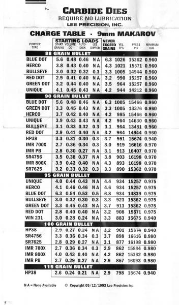 La tabla específica para 9 Makarov es de Lee y menciona pólvoras que yo ni he visto. Las otras dos tablas pertenecen al Manual de Recarga Nº 3 de René Malfatti y se maneja con las pólvoras francesas, que seguro que nos suenan más. Pero ojo! que no son para el 9 Mak, sino para el