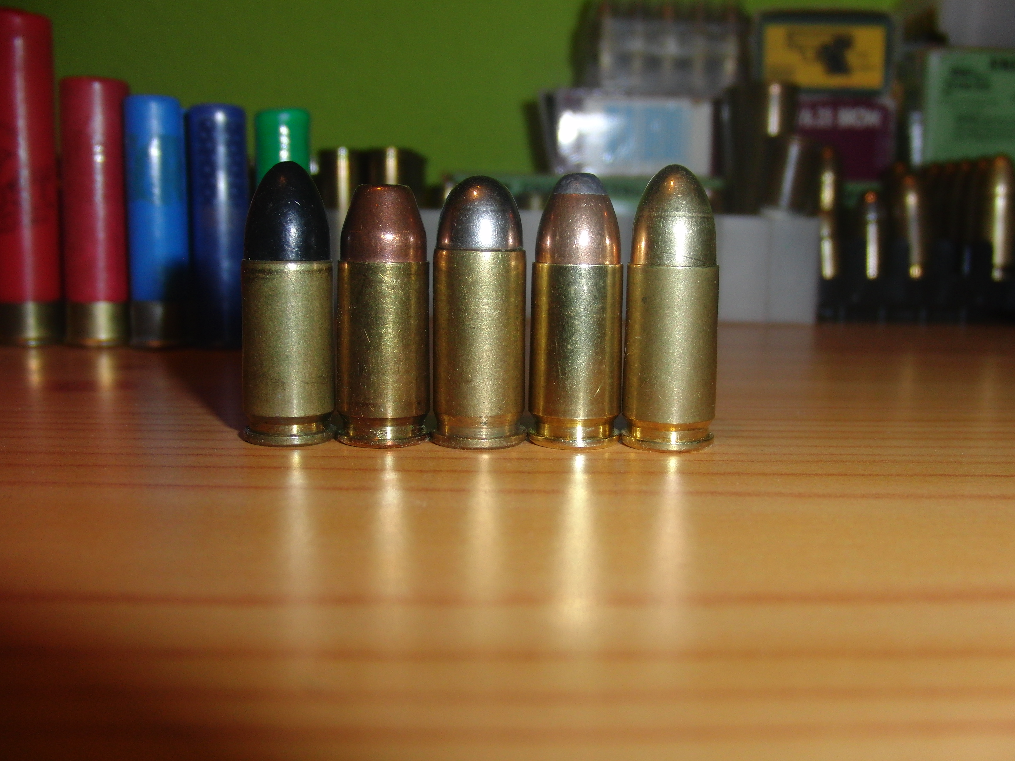 Hola a todos. Fijaros en el cartucho del centro, es un 9mmBrowning y los otros son 9mmPb. Como veis el casquillo es un poco mayor que los del 9mmPb. Lo que no se es si se puede introducir en un arma recamarada al 9mmPb. Adjunto fotos: