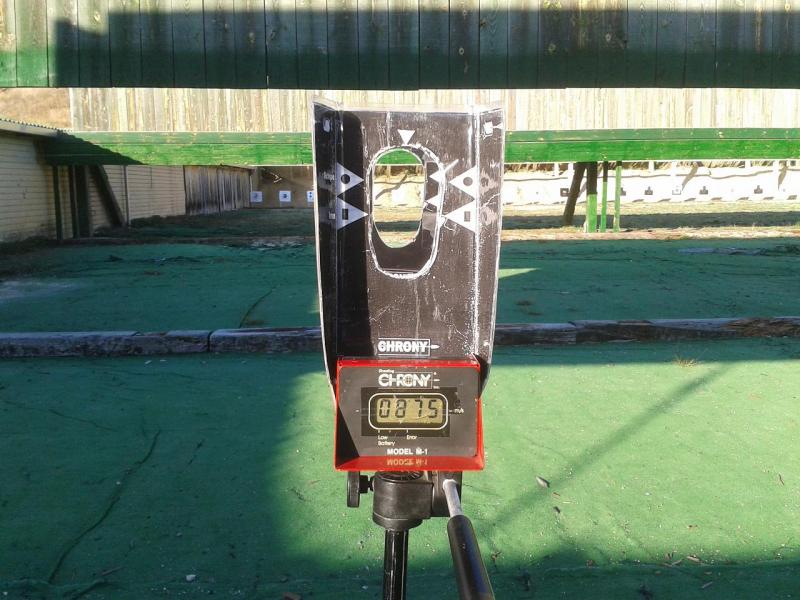 La media de 10 cartuchos con una carga que considero normalita me ha dado en el Chrony una velocidad de 863 m/s.