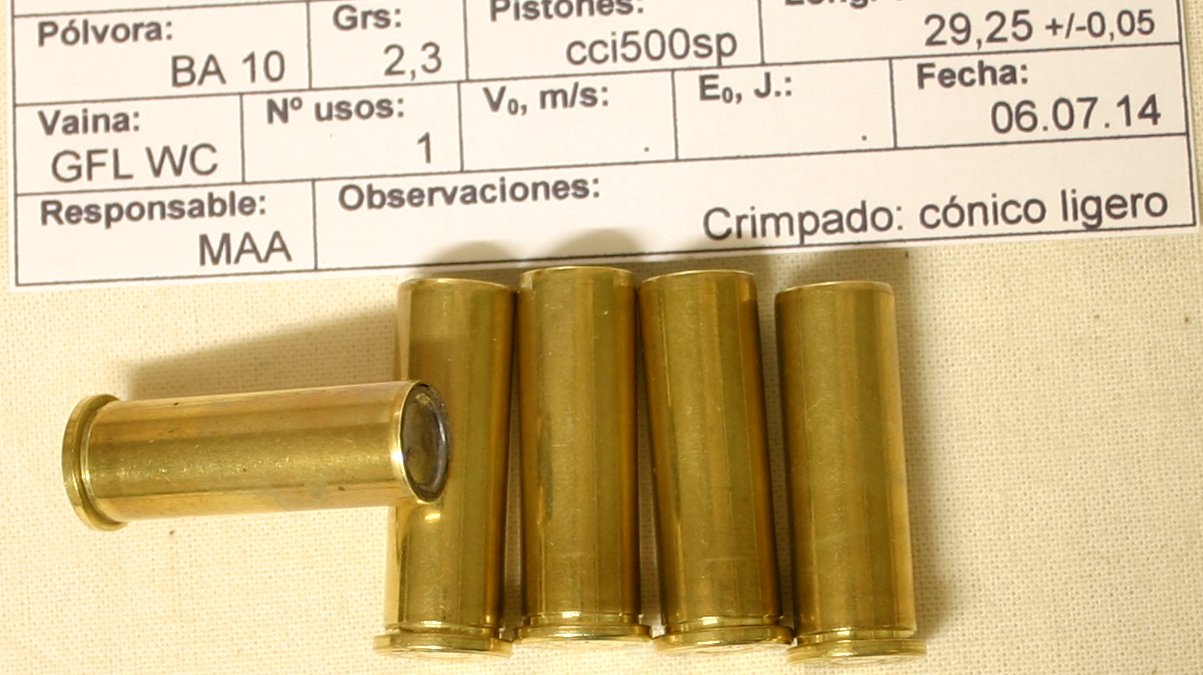 Habitualmente recargo el 38 WC con 2,4 grs de GM3, la BA10 suelo usarla únicamente con el 32 WC, el 9 Corto y tambien para recargar 38 SPL con puntas RG Pugnator SWC, con 3 grs. Estos días he utilizado BA10 para el 38 WC y me he encontrado con varias vainas rajadas, le he metido 2,3 grains de BA10, y de 15 cartuchos 2 rajados y uno "picado". Con 2,1 grains de BA10, de 5 cartuchos 1 rajado. No he medido velocidades, la pólvora es el final de un bote que tiene ya un par de años y hasta ahora no me ha dado problemas. En los pistones no noto síntomas de sobrepresión, en el disparo tampoco he notado nada fuera de lo normal y comparándolo con el 38 WC original de Fiocchi apenas hay diferencia.