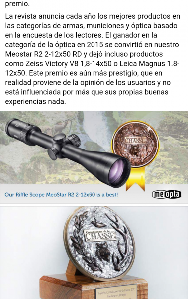 Un poco más económicos ( por no decir otra cosa ) están los Meopta de la serie MeoStar2 los hay en 1,7-10×42 o 2-12×50 y en cuanto a calidad no están tan lejos de los top.........en calidad-precio es de lo más competitivo. Saludos