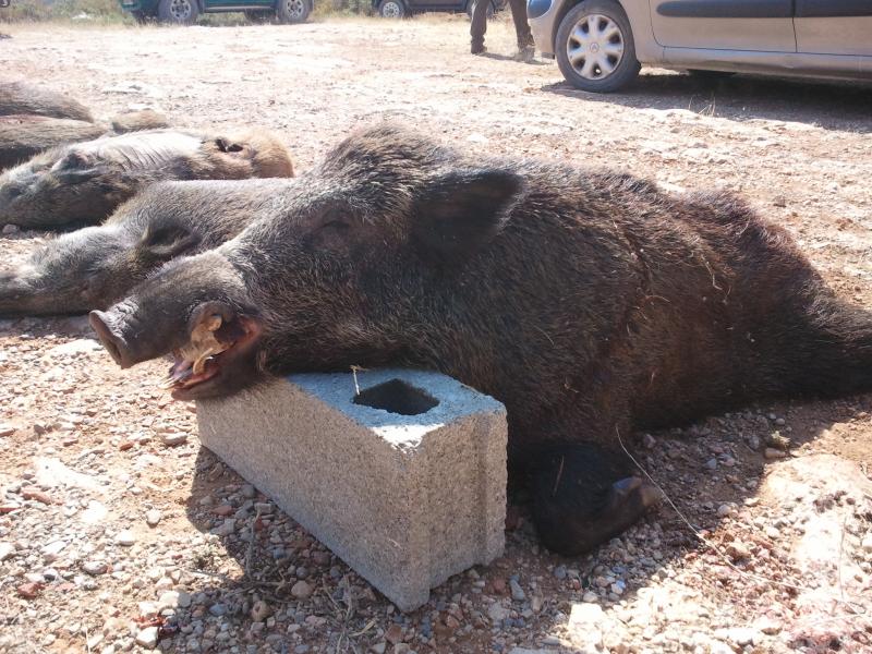 Amaneció un dia soleado y caluroso y aunque empezamos a cazar bastante pronto, los perros y rehaleros acabaron agotados del cansancio. Yo me encontraba en una zona de barranco, frente una falda de montaña, sentado y a la expectativa de la suelta de los perros. Veo que los sueltan a trescientos metros a mi derecha, muy cerca, y pienso... nada más peinen mi zona se acabó, ya tenía el dia echado. Cual fue mi sorpresa que dos minutos mas tarde un podenco blanco y otro canela levantan un cochino enorme de su encame y yo con mi nuevo visor, sin saber muy bien que hacer de los nervios que tenía, pongo los aumentos a 2,5 y PUM! el primer fallo, sigue su marcha y PUM! seguía corriendo... me pasaron mil cosas por la cabeza, cojo aire, respiro y PUM! no sale del arbusto... está muerto seguro. Siguiendo a los perros llegaron los rehaleros hasta el bicho que estaba a unos 100 metros de mí, en la falda de enfrente y me dicen: Vaya macho! Madre mía!