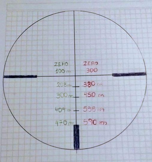En este caso, nos seguiremos valiendo de la tabla balística. O mejor aún de un dibujo del retículo con datos referenciales de caída y distancia. Con el fin de ser más rápidos y simples a la hora de tirar.