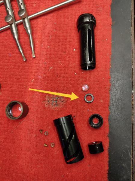 Parece ser q esa pieza no tenía fijador, como el resto de las roscas (no veas lo q costó desmontar el ocular) o q de alguna manera la rosca se pasó al apretarlo y no hacía su función (intentamos volver a roscarlo, pero acababa saltando y quedando suelto).