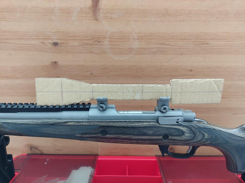 Para comprobar si me tocaba la campana, he hecho una plantilla en cartón con las medidas orientativas que he calculado a partir de una foto y sabiendo la longitud del visor...y efectivamente me toca al carril. Nada q no se pueda solucionar desmontándolo, pero preferiría no hacerlo por conservar un poco la estética del rifle.