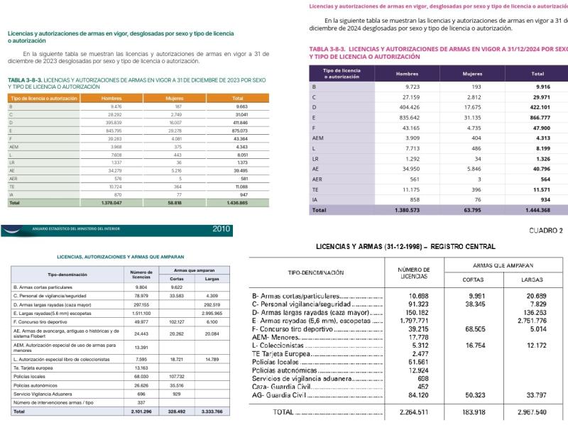 En 2024 y 2025, las licencias concedidas por primera vez han sido unas 45.000 cada año. Siendo estas las cifras de licencias a 31/12 de cada año, y para comparar con tiempos pasados, pongo también 2010 y 1998. Se ve que el grueso de las licencias está en la caza, principalmente en la E, las escopetas de caza, que va en caida libre, y la D.