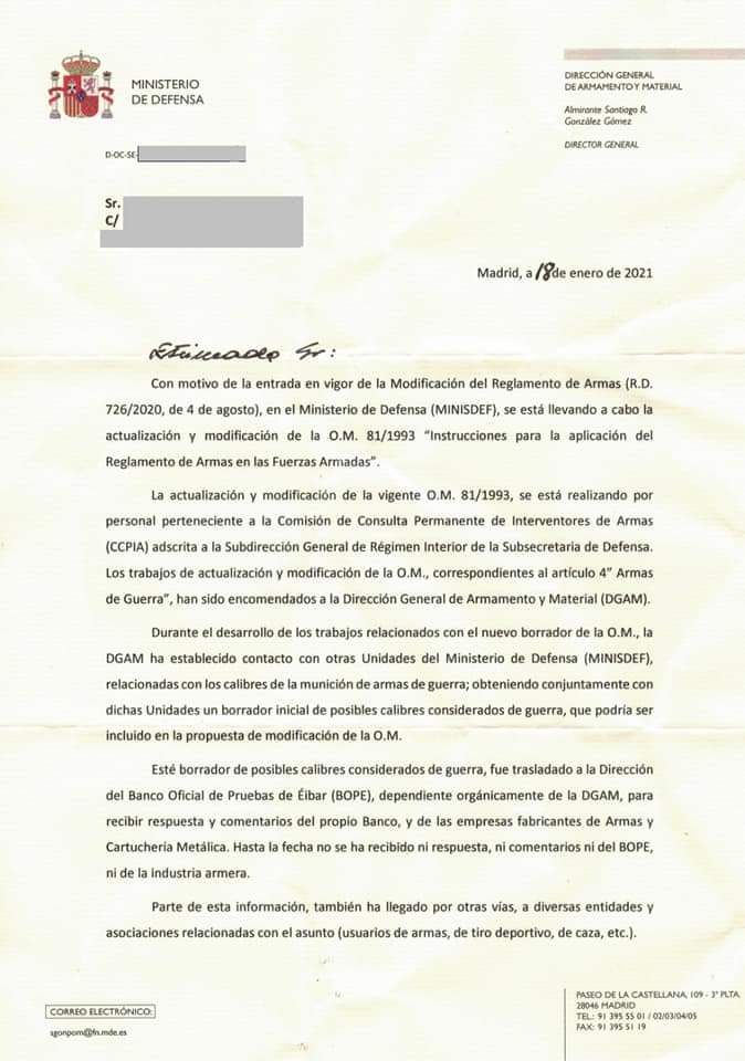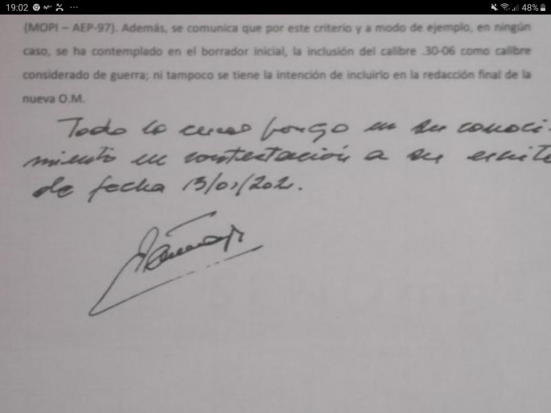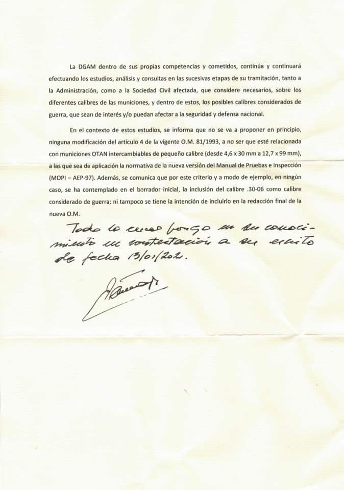 Te pongo la carta de Anarma ?????....... Reunión con la DGAM por qué querían meter nuevos calibres en la lista " de guerra " lo cual se ha demostrado que es verdad, al igual en la nota se dice que la lista que le da Anarma al coronel hay calibres que no son, pero que hay lista para meter nuevas prohibiciones es un hecho........ Ahora que nos quedamos que como no tienen pensado por el momento nada del 30-06 todo es mentira ?????...... Eso se llama cogérsela con papel de fumar. :saluting-soldier: