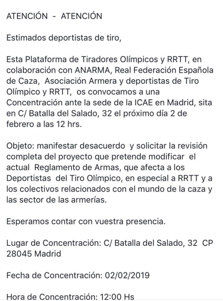 Pues ale...a divulgar la protesta que se pretende hacer en Madrid delante del edificio donde se ubica la ICAE, aficionados TODOS del mundo de las armas y familiares YA NO NOS QUEDAN MÁS CARTUCHOS EN LA RECÁMARA. Acude para luego no quejarse.