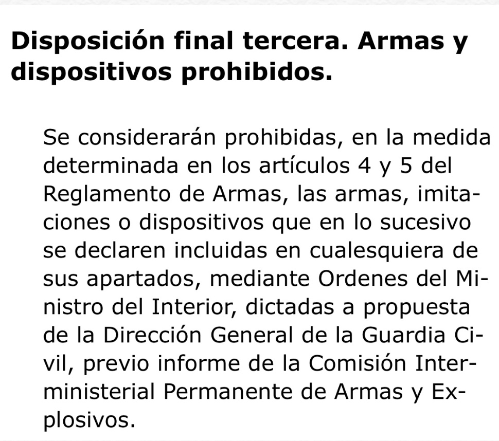 Como la disposición final tercera, que permite al Gobierno (a propuesta como siempre de esa Dirección General de la GC que tanto nos quiere) endurecer un Real Decreto ya de por sí restrictivo como le dé la gana, sobre la marcha en cada momento, de un día para otro, mediante instrucciones técnicas complementarias con rango de simple orden ministerial. Ni en Arabia.