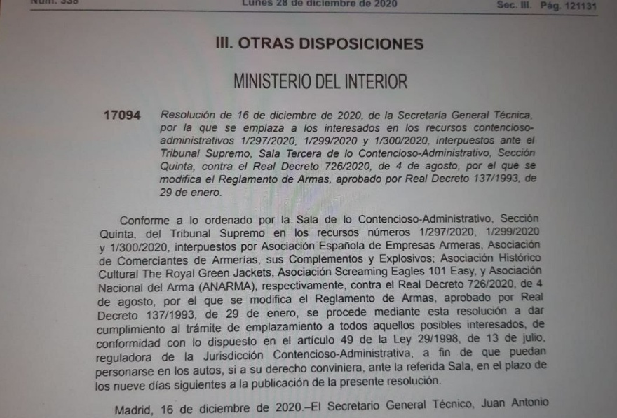 En la reunión que ANARMA mantuvo con la DGAM el pasado 15/12/2020, el Coronel Juan Carlos París, admitió que se había iniciado un proceso de modificación de la lista de calibres de guerra prohibidos a civiles, a raíz de la aparición de un nuevo Reglamento de Armas. Se nos dijo que nuestro listado de calibres filtrado tenía algunos errores, pero que NO se nos iba a dar información sobre los mismos. Que se había iniciado un proceso de consulta a las partes interesadas desde el Banco Oficial de Pruebas de Eibar (BOPE), de la cual parece que todavía nadie sabe nada. Pero que en cualquier caso, quien decidía el tema eran ellos y que no tenían que dar explicaciones de nada a nadie. Que los usuarios de armas no les importaban nada, si acaso "algo" el sector armero. La crónica de la esperpéntica reunión se puede encontrar AQUÍ.
