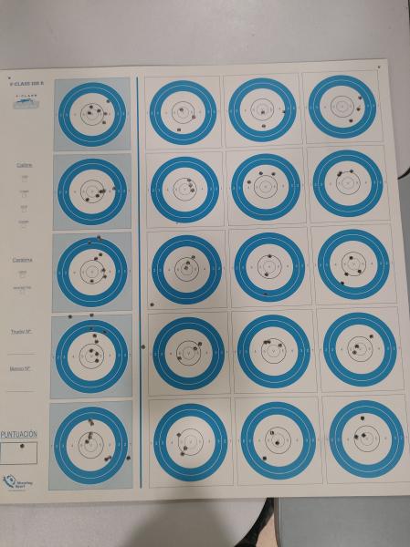 Tengo que decir que me divertí mucho, y voy a seguir entrenando por si me pica el gusanillo y me acerco a Cartagena que me pilla cerca, que suelen hacer tiradas de producción. El día de la prueba había bastantes rachas de aire, y como sólo era para centrar el visor usé CCI Standar que sé que no es lo mejor para tirar así, pero ya probaré otras, como la RWS Rifle Match que le va genial a mi TOZ-17-01. Aquí os pongo la foto de la diana, le tiré 3 veces a cada una, y no sé si es lo correcto. Por favor no me metáis mucha caña que es mi primera vez con visor y probando está disciplina. Saludos