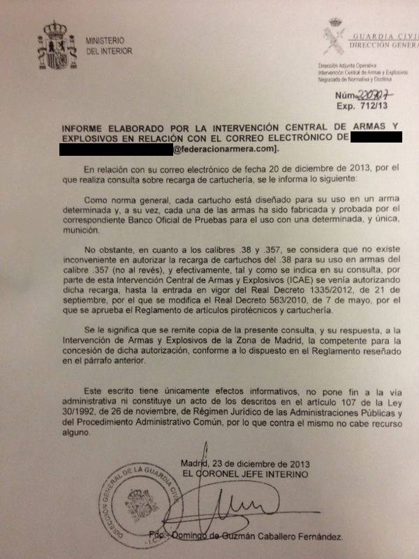 Ahora surge el problema en nuestra intervención, en Valladolid, dicen que no, que si pone 357, no se puede comprar munición del 38 para ese arma, y no se andan con bromas, amenazan con todo al Conserje del Campo de Tiro, al Delegado de Precisión, al Secretario también, que si venden munición les van a denunciar, en fin, que como casi no quedan revólveres del 38 Spl y la mayoría son del 357, ni se vende munición, ni los tiradores pueden practicar y competir, ni nada de nada; así que si no tienen autorización de recarga, que puede hacer ésta gente?. Si la tienen ya lo sabemos.