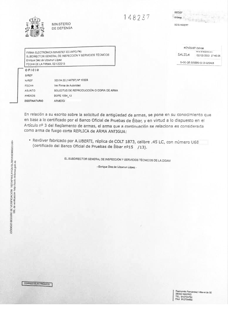 Es evidente que todo este procedimiento tiene por objeto la inscripción de una réplica de arma antigua, no se trata de un arma original, de ahí la confusión inicial.
