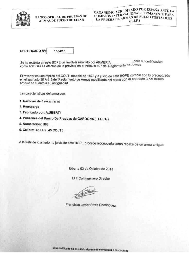 Creo que hay algo que no entiendo. Le han pedido el certificado BOPE de que es un arma antigua y lo ha conseguido, y ahora le piden otro que diga que es RÉPLICA.