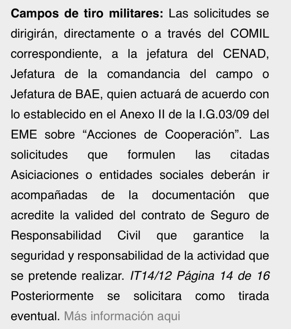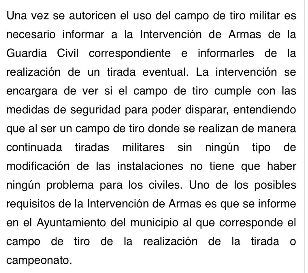 El uso de las instalaciones militares tiene su historia. Al final depende del campo. Nunca he tenido problema en que se autorice un campo de tiro militar, el problema son las condiciones. Igual que a nivel civil los campos militares facilitan mucho las exigencias impuestas, las normas militares, como la de los horarios son más complicadas.